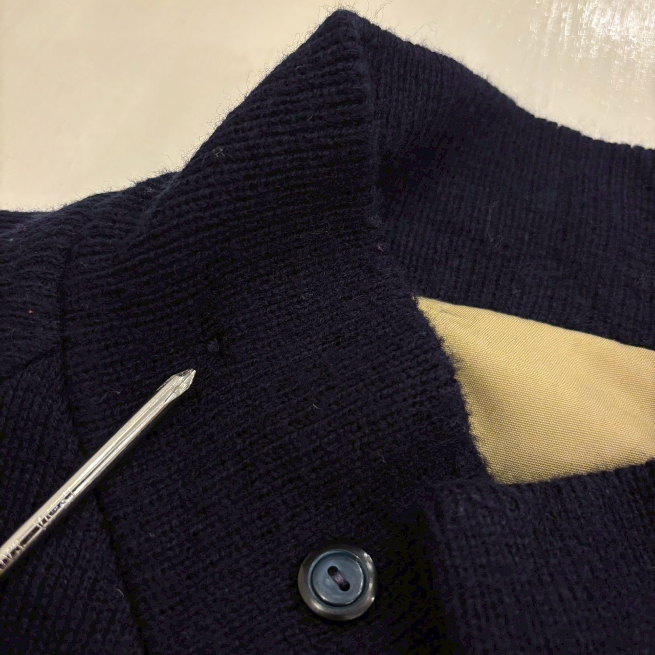 表面はネイビーのアクリルニット生地で、
